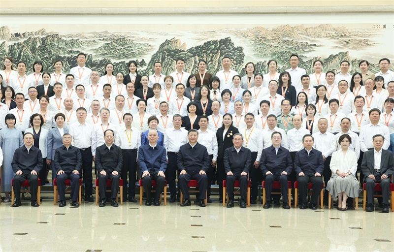 ??会前,习近平等领导同志亲切接见了参加庆祝第四十个教师节暨全国教育系统先进集体和先进个人表彰活动代表,同代表们热情握手,并同大家合影留念。
